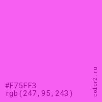 Цвет #F75FF3 в цветовой модели RGB обозначается тремя октетами (247, 95, 243) в десятичном формате и #F75FF3 в шестнадцатиричном (hex) формате, которые являются интенсивностью красного 247 (hex F7), интенсивность зелёного 95 (hex 5F) и интенсивность синего 243 (hex F3).