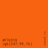 Цвет #F76310 в цветовой модели RGB обозначается тремя октетами (247, 99, 16) в десятичном формате и #F76310 в шестнадцатиричном (hex) формате, которые являются интенсивностью красного 247 (hex F7), интенсивность зелёного 99 (hex 63) и интенсивность синего 16 (hex 10).