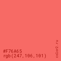 Цвет #F76A65 в цветовой модели RGB обозначается тремя октетами (247, 106, 101) в десятичном формате и #F76A65 в шестнадцатиричном (hex) формате, которые являются интенсивностью красного 247 (hex F7), интенсивность зелёного 106 (hex 6A) и интенсивность синего 101 (hex 65).