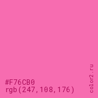 Цвет #F76CB0 в цветовой модели RGB обозначается тремя октетами (247, 108, 176) в десятичном формате и #F76CB0 в шестнадцатиричном (hex) формате, которые являются интенсивностью красного 247 (hex F7), интенсивность зелёного 108 (hex 6C) и интенсивность синего 176 (hex B0).