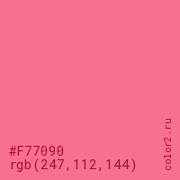 Цвет #F77090 в цветовой модели RGB обозначается тремя октетами (247, 112, 144) в десятичном формате и #F77090 в шестнадцатиричном (hex) формате, которые являются интенсивностью красного 247 (hex F7), интенсивность зелёного 112 (hex 70) и интенсивность синего 144 (hex 90).