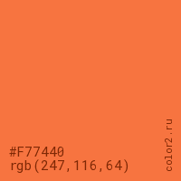Цвет #F77440 в цветовой модели RGB обозначается тремя октетами (247, 116, 64) в десятичном формате и #F77440 в шестнадцатиричном (hex) формате, которые являются интенсивностью красного 247 (hex F7), интенсивность зелёного 116 (hex 74) и интенсивность синего 64 (hex 40).