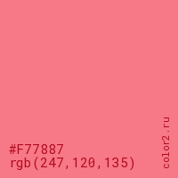 Цвет #F77887 в цветовой модели RGB обозначается тремя октетами (247, 120, 135) в десятичном формате и #F77887 в шестнадцатиричном (hex) формате, которые являются интенсивностью красного 247 (hex F7), интенсивность зелёного 120 (hex 78) и интенсивность синего 135 (hex 87).
