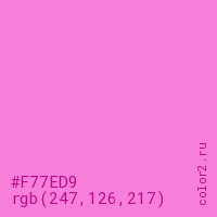 Цвет #F77ED9 в цветовой модели RGB обозначается тремя октетами (247, 126, 217) в десятичном формате и #F77ED9 в шестнадцатиричном (hex) формате, которые являются интенсивностью красного 247 (hex F7), интенсивность зелёного 126 (hex 7E) и интенсивность синего 217 (hex D9).