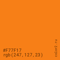 Цвет #F77F17 в цветовой модели RGB обозначается тремя октетами (247, 127, 23) в десятичном формате и #F77F17 в шестнадцатиричном (hex) формате, которые являются интенсивностью красного 247 (hex F7), интенсивность зелёного 127 (hex 7F) и интенсивность синего 23 (hex 17).