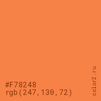 Цвет #F78248 в цветовой модели RGB обозначается тремя октетами (247, 130, 72) в десятичном формате и #F78248 в шестнадцатиричном (hex) формате, которые являются интенсивностью красного 247 (hex F7), интенсивность зелёного 130 (hex 82) и интенсивность синего 72 (hex 48).
