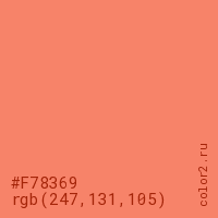 Цвет #F78369 в цветовой модели RGB обозначается тремя октетами (247, 131, 105) в десятичном формате и #F78369 в шестнадцатиричном (hex) формате, которые являются интенсивностью красного 247 (hex F7), интенсивность зелёного 131 (hex 83) и интенсивность синего 105 (hex 69).