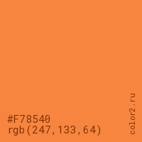 Цвет #F78540 в цветовой модели RGB обозначается тремя октетами (247, 133, 64) в десятичном формате и #F78540 в шестнадцатиричном (hex) формате, которые являются интенсивностью красного 247 (hex F7), интенсивность зелёного 133 (hex 85) и интенсивность синего 64 (hex 40).