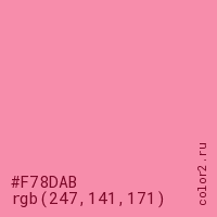 Цвет #F78DAB в цветовой модели RGB обозначается тремя октетами (247, 141, 171) в десятичном формате и #F78DAB в шестнадцатиричном (hex) формате, которые являются интенсивностью красного 247 (hex F7), интенсивность зелёного 141 (hex 8D) и интенсивность синего 171 (hex AB).