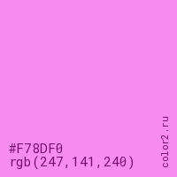 Цвет #F78DF0 в цветовой модели RGB обозначается тремя октетами (247, 141, 240) в десятичном формате и #F78DF0 в шестнадцатиричном (hex) формате, которые являются интенсивностью красного 247 (hex F7), интенсивность зелёного 141 (hex 8D) и интенсивность синего 240 (hex F0).