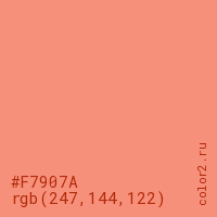 Цвет RGB(247, 144, 122) в процентом отношении количества цвета состоит из 96.9% красного (red), 56.5% зелёного (green) и 47.8% синего (blue).