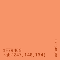 Цвет #F79468 в цветовой модели RGB обозначается тремя октетами (247, 148, 104) в десятичном формате и #F79468 в шестнадцатиричном (hex) формате, которые являются интенсивностью красного 247 (hex F7), интенсивность зелёного 148 (hex 94) и интенсивность синего 104 (hex 68).