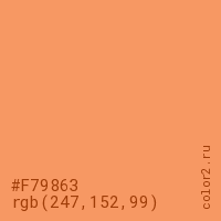 Цвет #F79863 в цветовой модели RGB обозначается тремя октетами (247, 152, 99) в десятичном формате и #F79863 в шестнадцатиричном (hex) формате, которые являются интенсивностью красного 247 (hex F7), интенсивность зелёного 152 (hex 98) и интенсивность синего 99 (hex 63).