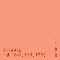 Цвет #F7997D в цветовой модели RGB обозначается тремя октетами (247, 153, 125) в десятичном формате и #F7997D в шестнадцатиричном (hex) формате, которые являются интенсивностью красного 247 (hex F7), интенсивность зелёного 153 (hex 99) и интенсивность синего 125 (hex 7D).