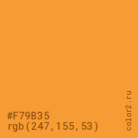 Цвет #F79B35 в цветовой модели RGB обозначается тремя октетами (247, 155, 53) в десятичном формате и #F79B35 в шестнадцатиричном (hex) формате, которые являются интенсивностью красного 247 (hex F7), интенсивность зелёного 155 (hex 9B) и интенсивность синего 53 (hex 35).