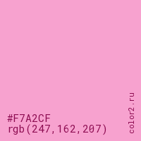Цвет #F7A2CF в цветовой модели RGB обозначается тремя октетами (247, 162, 207) в десятичном формате и #F7A2CF в шестнадцатиричном (hex) формате, которые являются интенсивностью красного 247 (hex F7), интенсивность зелёного 162 (hex A2) и интенсивность синего 207 (hex CF).