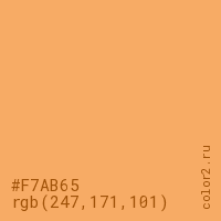Цвет #F7AB65 в цветовой модели RGB обозначается тремя октетами (247, 171, 101) в десятичном формате и #F7AB65 в шестнадцатиричном (hex) формате, которые являются интенсивностью красного 247 (hex F7), интенсивность зелёного 171 (hex AB) и интенсивность синего 101 (hex 65).