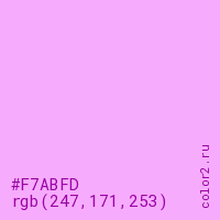Цвет #F7ABFD в цветовой модели RGB обозначается тремя октетами (247, 171, 253) в десятичном формате и #F7ABFD в шестнадцатиричном (hex) формате, которые являются интенсивностью красного 247 (hex F7), интенсивность зелёного 171 (hex AB) и интенсивность синего 253 (hex FD).