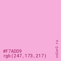 Цвет #F7ADD9 в цветовой модели RGB обозначается тремя октетами (247, 173, 217) в десятичном формате и #F7ADD9 в шестнадцатиричном (hex) формате, которые являются интенсивностью красного 247 (hex F7), интенсивность зелёного 173 (hex AD) и интенсивность синего 217 (hex D9).