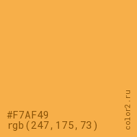 Цвет #F7AF49 в цветовой модели RGB обозначается тремя октетами (247, 175, 73) в десятичном формате и #F7AF49 в шестнадцатиричном (hex) формате, которые являются интенсивностью красного 247 (hex F7), интенсивность зелёного 175 (hex AF) и интенсивность синего 73 (hex 49).