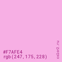 Цвет #F7AFE4 в цветовой модели RGB обозначается тремя октетами (247, 175, 228) в десятичном формате и #F7AFE4 в шестнадцатиричном (hex) формате, которые являются интенсивностью красного 247 (hex F7), интенсивность зелёного 175 (hex AF) и интенсивность синего 228 (hex E4).