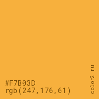 Цвет #F7B03D в цветовой модели RGB обозначается тремя октетами (247, 176, 61) в десятичном формате и #F7B03D в шестнадцатиричном (hex) формате, которые являются интенсивностью красного 247 (hex F7), интенсивность зелёного 176 (hex B0) и интенсивность синего 61 (hex 3D).