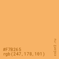 Цвет #F7B265 в цветовой модели RGB обозначается тремя октетами (247, 178, 101) в десятичном формате и #F7B265 в шестнадцатиричном (hex) формате, которые являются интенсивностью красного 247 (hex F7), интенсивность зелёного 178 (hex B2) и интенсивность синего 101 (hex 65).