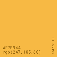 Цвет #F7B944 в цветовой модели RGB обозначается тремя октетами (247, 185, 68) в десятичном формате и #F7B944 в шестнадцатиричном (hex) формате, которые являются интенсивностью красного 247 (hex F7), интенсивность зелёного 185 (hex B9) и интенсивность синего 68 (hex 44).