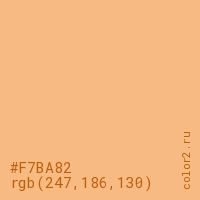 Цвет #F7BA82 в цветовой модели RGB обозначается тремя октетами (247, 186, 130) в десятичном формате и #F7BA82 в шестнадцатиричном (hex) формате, которые являются интенсивностью красного 247 (hex F7), интенсивность зелёного 186 (hex BA) и интенсивность синего 130 (hex 82).