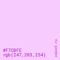 Цвет #F7CBFE в цветовой модели RGB обозначается тремя октетами (247, 203, 254) в десятичном формате и #F7CBFE в шестнадцатиричном (hex) формате, которые являются интенсивностью красного 247 (hex F7), интенсивность зелёного 203 (hex CB) и интенсивность синего 254 (hex FE).