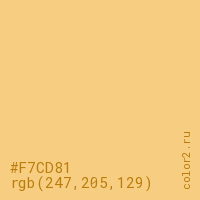 Цвет #F7CD81 в цветовой модели RGB обозначается тремя октетами (247, 205, 129) в десятичном формате и #F7CD81 в шестнадцатиричном (hex) формате, которые являются интенсивностью красного 247 (hex F7), интенсивность зелёного 205 (hex CD) и интенсивность синего 129 (hex 81).