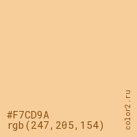 Цвет RGB(247, 205, 154) в процентом отношении количества цвета состоит из 96.9% красного (red), 80.4% зелёного (green) и 60.4% синего (blue).