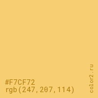 Цвет #F7CF72 в цветовой модели RGB обозначается тремя октетами (247, 207, 114) в десятичном формате и #F7CF72 в шестнадцатиричном (hex) формате, которые являются интенсивностью красного 247 (hex F7), интенсивность зелёного 207 (hex CF) и интенсивность синего 114 (hex 72).