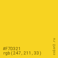 Цвет #F7D321 в цветовой модели RGB обозначается тремя октетами (247, 211, 33) в десятичном формате и #F7D321 в шестнадцатиричном (hex) формате, которые являются интенсивностью красного 247 (hex F7), интенсивность зелёного 211 (hex D3) и интенсивность синего 33 (hex 21).