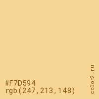 Цвет #F7D594 в цветовой модели RGB обозначается тремя октетами (247, 213, 148) в десятичном формате и #F7D594 в шестнадцатиричном (hex) формате, которые являются интенсивностью красного 247 (hex F7), интенсивность зелёного 213 (hex D5) и интенсивность синего 148 (hex 94).