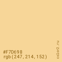 Цвет #F7D698 в цветовой модели RGB обозначается тремя октетами (247, 214, 152) в десятичном формате и #F7D698 в шестнадцатиричном (hex) формате, которые являются интенсивностью красного 247 (hex F7), интенсивность зелёного 214 (hex D6) и интенсивность синего 152 (hex 98).