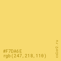 Цвет #F7DA6E в цветовой модели RGB обозначается тремя октетами (247, 218, 110) в десятичном формате и #F7DA6E в шестнадцатиричном (hex) формате, которые являются интенсивностью красного 247 (hex F7), интенсивность зелёного 218 (hex DA) и интенсивность синего 110 (hex 6E).