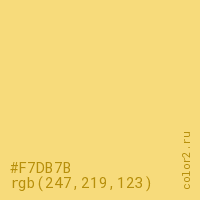 Цвет #F7DB7B в цветовой модели RGB обозначается тремя октетами (247, 219, 123) в десятичном формате и #F7DB7B в шестнадцатиричном (hex) формате, которые являются интенсивностью красного 247 (hex F7), интенсивность зелёного 219 (hex DB) и интенсивность синего 123 (hex 7B).