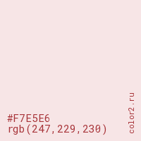 Цвет #F7E5E6 в цветовой модели RGB обозначается тремя октетами (247, 229, 230) в десятичном формате и #F7E5E6 в шестнадцатиричном (hex) формате, которые являются интенсивностью красного 247 (hex F7), интенсивность зелёного 229 (hex E5) и интенсивность синего 230 (hex E6).