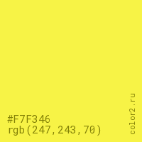 Цвет #F7F346 в цветовой модели RGB обозначается тремя октетами (247, 243, 70) в десятичном формате и #F7F346 в шестнадцатиричном (hex) формате, которые являются интенсивностью красного 247 (hex F7), интенсивность зелёного 243 (hex F3) и интенсивность синего 70 (hex 46).