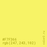 Цвет #F7F366 в цветовой модели RGB обозначается тремя октетами (247, 243, 102) в десятичном формате и #F7F366 в шестнадцатиричном (hex) формате, которые являются интенсивностью красного 247 (hex F7), интенсивность зелёного 243 (hex F3) и интенсивность синего 102 (hex 66).