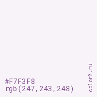 Цвет #F7F3F8 в цветовой модели RGB обозначается тремя октетами (247, 243, 248) в десятичном формате и #F7F3F8 в шестнадцатиричном (hex) формате, которые являются интенсивностью красного 247 (hex F7), интенсивность зелёного 243 (hex F3) и интенсивность синего 248 (hex F8).