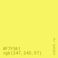 Цвет #F7F561 в цветовой модели RGB обозначается тремя октетами (247, 245, 97) в десятичном формате и #F7F561 в шестнадцатиричном (hex) формате, которые являются интенсивностью красного 247 (hex F7), интенсивность зелёного 245 (hex F5) и интенсивность синего 97 (hex 61).