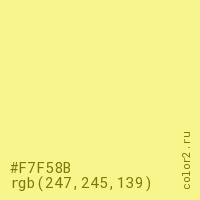 Цвет #F7F58B в цветовой модели RGB обозначается тремя октетами (247, 245, 139) в десятичном формате и #F7F58B в шестнадцатиричном (hex) формате, которые являются интенсивностью красного 247 (hex F7), интенсивность зелёного 245 (hex F5) и интенсивность синего 139 (hex 8B).