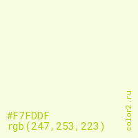 Цвет #F7FDDF в цветовой модели RGB обозначается тремя октетами (247, 253, 223) в десятичном формате и #F7FDDF в шестнадцатиричном (hex) формате, которые являются интенсивностью красного 247 (hex F7), интенсивность зелёного 253 (hex FD) и интенсивность синего 223 (hex DF).