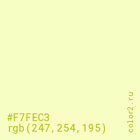 Цвет #F7FEC3 в цветовой модели RGB обозначается тремя октетами (247, 254, 195) в десятичном формате и #F7FEC3 в шестнадцатиричном (hex) формате, которые являются интенсивностью красного 247 (hex F7), интенсивность зелёного 254 (hex FE) и интенсивность синего 195 (hex C3).