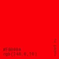 Цвет #F8000A в цветовой модели RGB обозначается тремя октетами (248, 0, 10) в десятичном формате и #F8000A в шестнадцатиричном (hex) формате, которые являются интенсивностью красного 248 (hex F8), интенсивность зелёного 0 (hex 00) и интенсивность синего 10 (hex 0A).