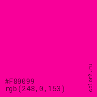Цвет #F80099 в цветовой модели RGB обозначается тремя октетами (248, 0, 153) в десятичном формате и #F80099 в шестнадцатиричном (hex) формате, которые являются интенсивностью красного 248 (hex F8), интенсивность зелёного 0 (hex 00) и интенсивность синего 153 (hex 99).