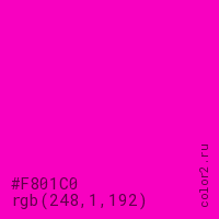 Цвет #F801C0 в цветовой модели RGB обозначается тремя октетами (248, 1, 192) в десятичном формате и #F801C0 в шестнадцатиричном (hex) формате, которые являются интенсивностью красного 248 (hex F8), интенсивность зелёного 1 (hex 01) и интенсивность синего 192 (hex C0).