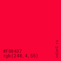 Цвет #F80437 в цветовой модели RGB обозначается тремя октетами (248, 4, 55) в десятичном формате и #F80437 в шестнадцатиричном (hex) формате, которые являются интенсивностью красного 248 (hex F8), интенсивность зелёного 4 (hex 04) и интенсивность синего 55 (hex 37).